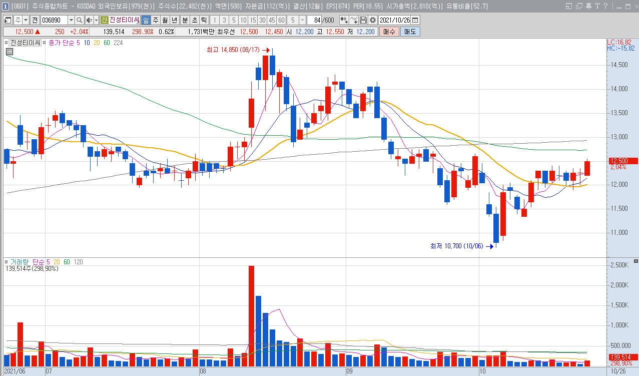 이전의 고점들을 돌파하면서 2% 넘게 올라주는 모습 입니다. 이제 하락 전의 12500원 부근까지는 회복을 했구요, 먼저 13000원 부근까지 올라주는게 중요하겠네요. 현재 거래량이 매우 낮고 사람들의 관심도가 적은 상황입니다. 저희 같은 개미들이 매집하기 좋은 자리이죠. 저는 이럴 때 얼른 2차 매집까지 천천히 진행할 생각 입니다. 12000원 선이 1차적인 지지선이 될테니까 12000원 선 가까이에서 조금씩 담으면 되겠지요. 아래에 걸어놓고 체결되면 좋은 거고 좋은 자리 안 주면 마는거구요.