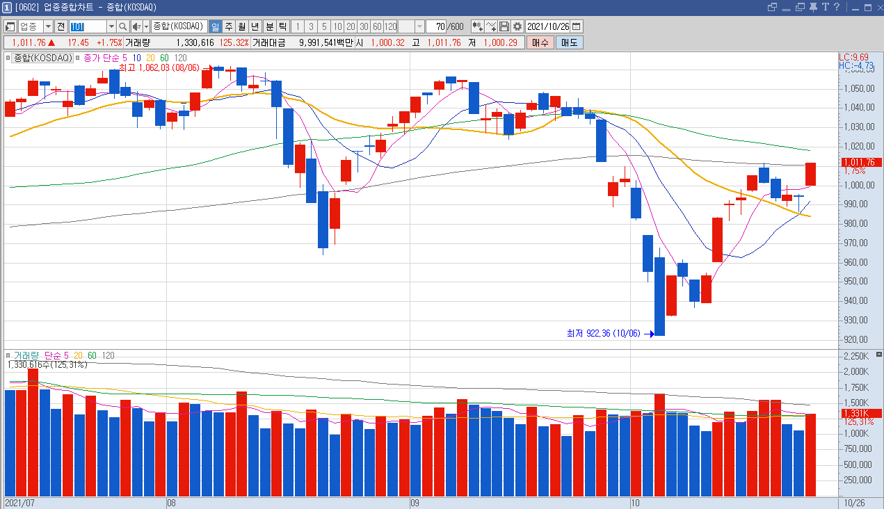 보시면 윗꼬리도 달지 않은 강한 상승형 양봉이 나오면서 무려 1.75%나 올랐습니다. 보시면 코스닥은 이미 이전의 저점은 한참 전에 회복한 상태였고 이제 이전의 전고점을 코 앞에 놔둔 상황이죠.