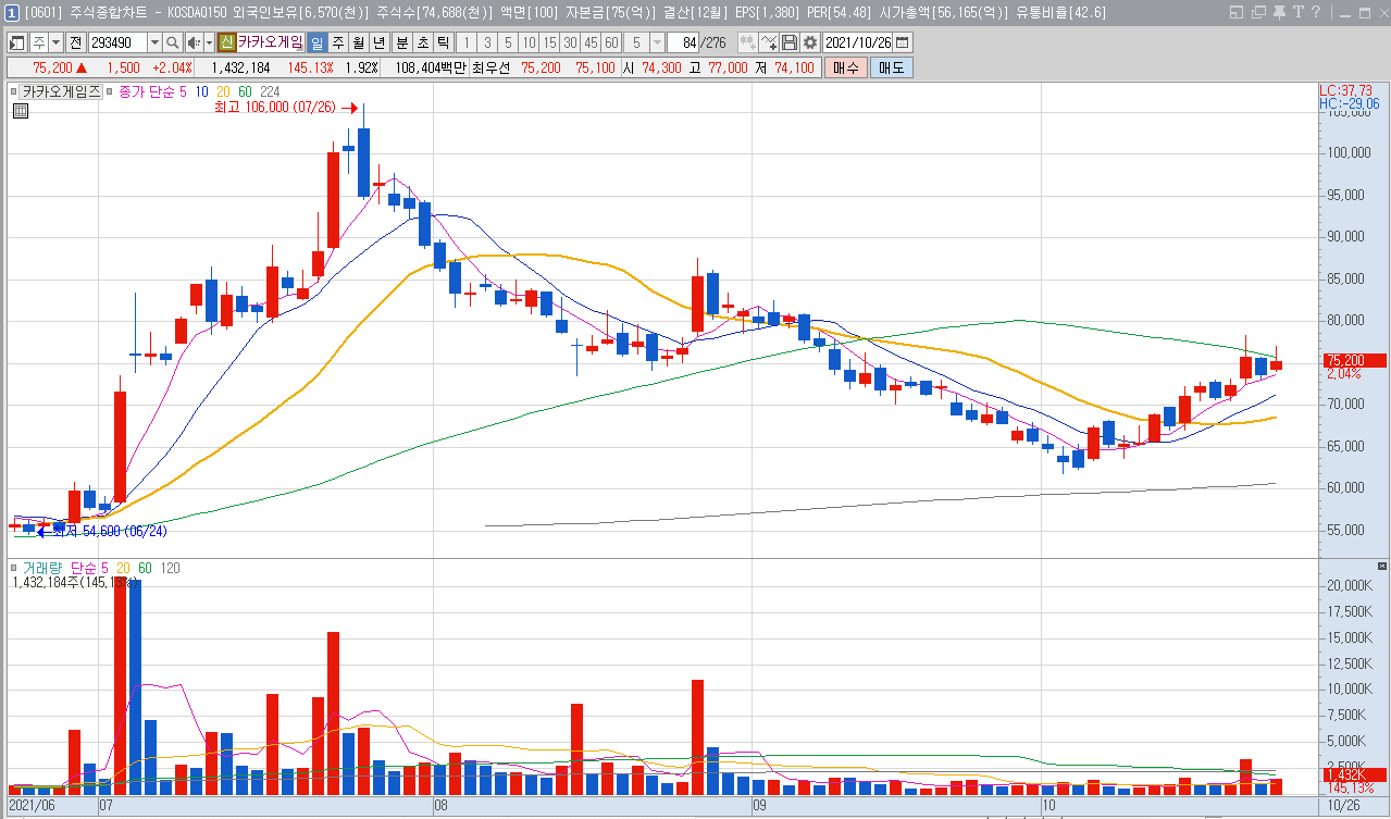 그럼 먼저 카카오게임즈부터 살펴 보면 여전히 좋은 흐름이 나와주고 있는데요, 일봉차트를 확인해 보겠습니다.