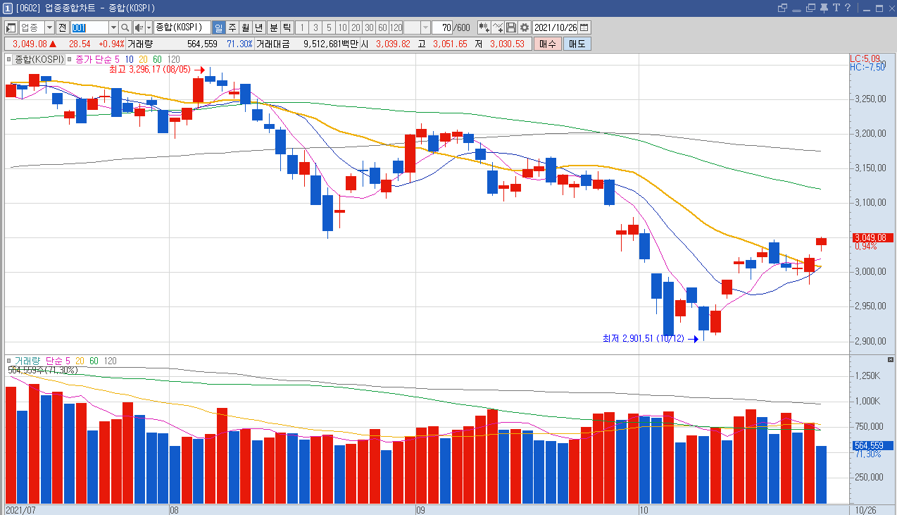 코스피지수의 일봉차트인데요, 강하게 갭상승으로 출발하면서 아주 좋은 흐름을 보였습니다. 지수도 1% 가까이 오르면서 마감을 하였구요, 이제 10월 초에 하락이 나오지 이전의 저점까지는 상승하였네요. 어떻게 보면 다행이고 어떻게 보면 참 아쉬운데 미장은 이미 진작에 회복하고 전고점을 돌파하고 있는 상황이거든요. 저희는 작은 악재만 나와도 지수가 올라가지 못하고, 전고점인 3200포인트 부근은 아직 먼 상황이구요. 아무래도 외국인 세력들이 꾸준히 매수해 주지 않으면 지수가 올라가기 어렵고 기관도 마찬가지 입니다. 한국증시는 이래서 큰 손들의 놀이터가 되는 경향이 있는 것 같아요.