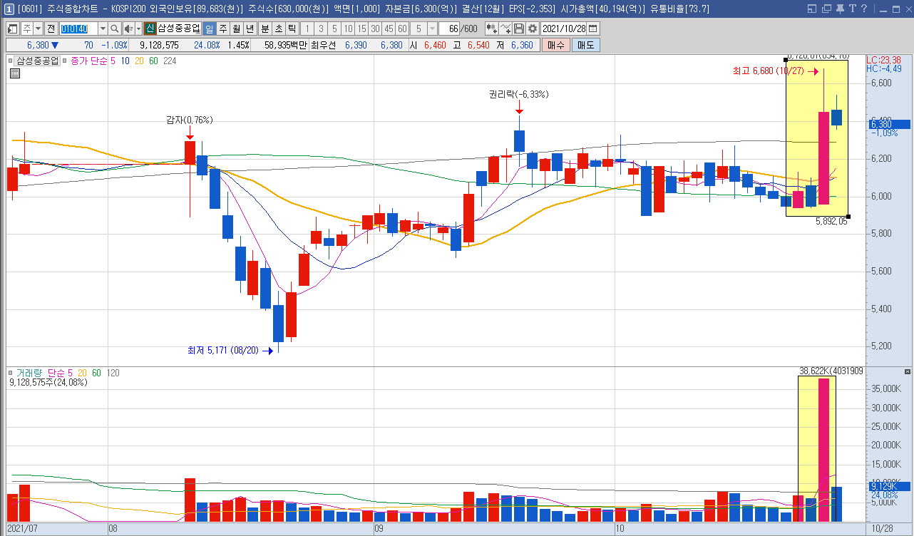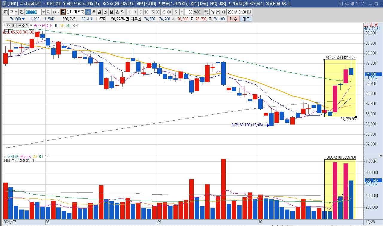 현대미포조선의 일봉차트 입니다. 삼성중공업과 비슷한 흐름이죠? 지지부진하던 흐름에서 큰 수급이 들어오면서 갑자기 상승으로 바뀌었네요.