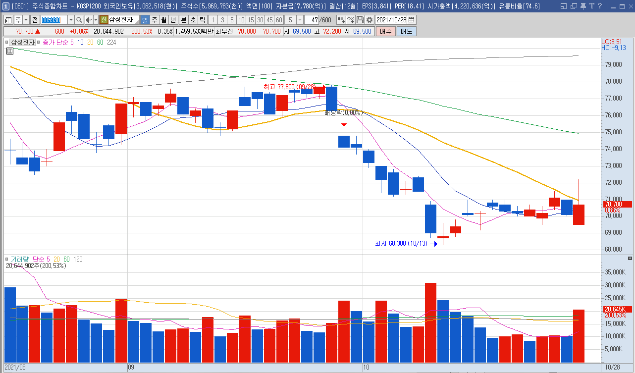 국민주 삼성전자의 주가 입니다. 오늘 3%까지 올랐다가 밀려서 0.86%로 마감했는데요. 지수에 비하면 올랐죠. 보통 하락장에서는 시총 1위인 삼성전자도 약세의 흐름을 보입니다. 그런데 그렇지 않았네요.