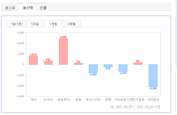 제가 코스피보다 코스닥을 좋게 보는 이유도 여기에 있습니다. 지난 1달 기준으로 외국인들이 많이 매도하지는 않았지요. 오히려 기타법인과 투신 쪽에서 매도를 많이 했네요. 코스닥 하락의 주체는 국내 내국인인 걸로... ^^;;