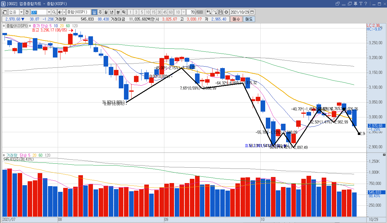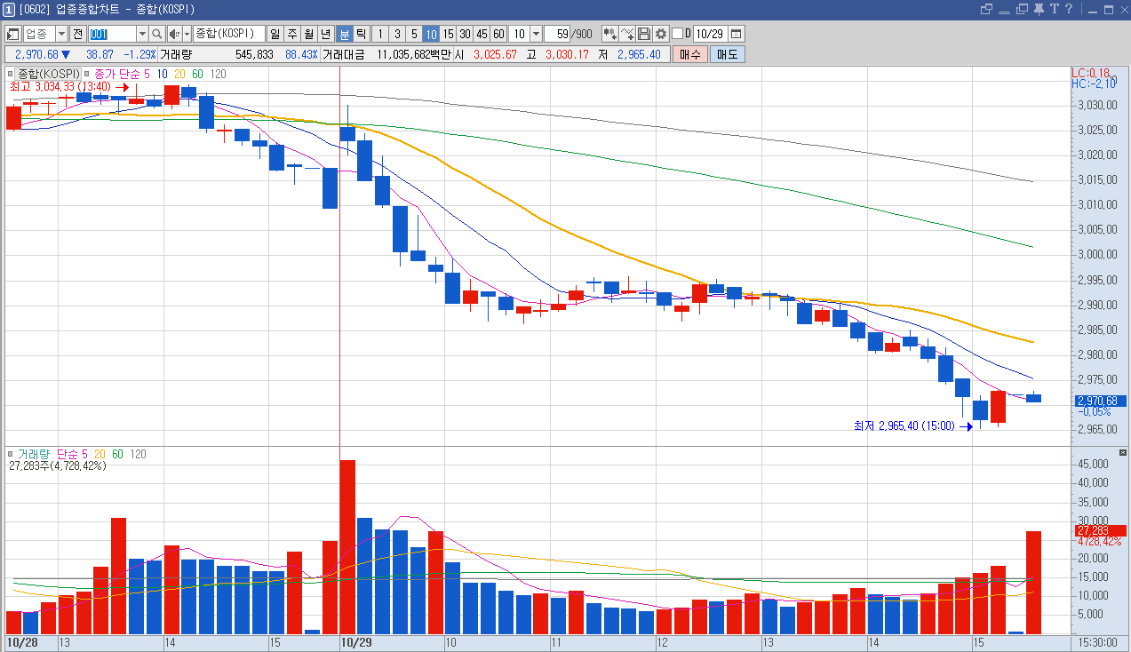 거의 눈썰매 수준으로 내려오고 있는데요, 시가에서 나왔던 5분동안의 상승이 오늘의 고점이 될 줄 누가 알았겠습니까... 다이나믹하게 떨어지는 모습을 보여주고 있네요. 중간에 2990포인트 부근을 지지해 주는 줄 알았는데 오후 1시가 넘어서 다시 내려가기 시작하더니 장 마감할 때까지 내리꼿는 흐름이 이어졌습니다. 장 마감 할 때서야 겨우 멈춘 느낌인데요...
