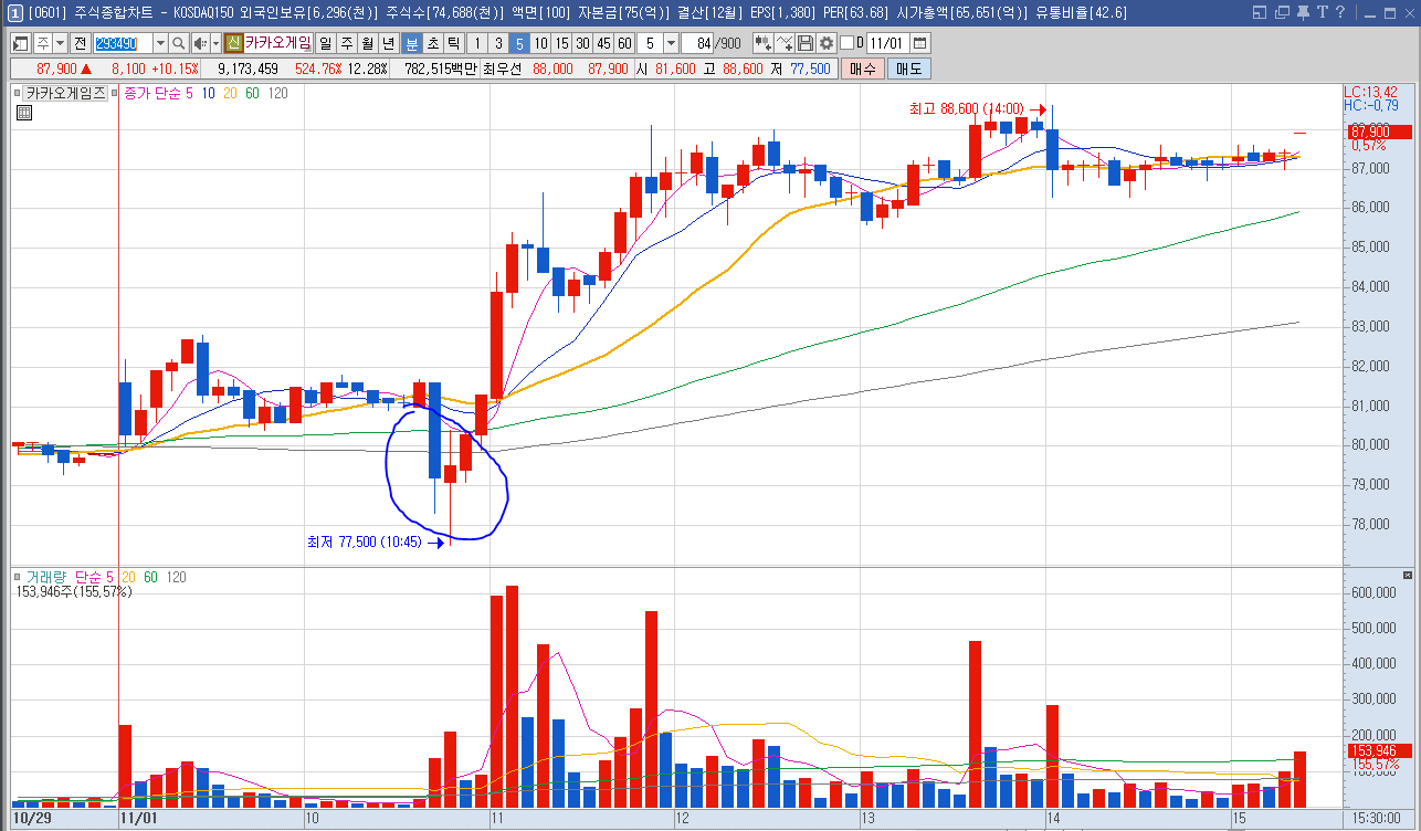 분봉으로 보시면 알 수 있는데요. 장 초반에는 큰 거래량이 들어온 것도 아니고 조용한 흐름이었는데요. 오히려 11시 부근에서는 약간의 매도 매물이 쏟아지면서 한 때는 77500원 선까지 떨어집니다. 그런데 이후로 계속 수급이 들어오면서 오르더니 장 마감 때까지 오르는 흐름이 이어졌죠.