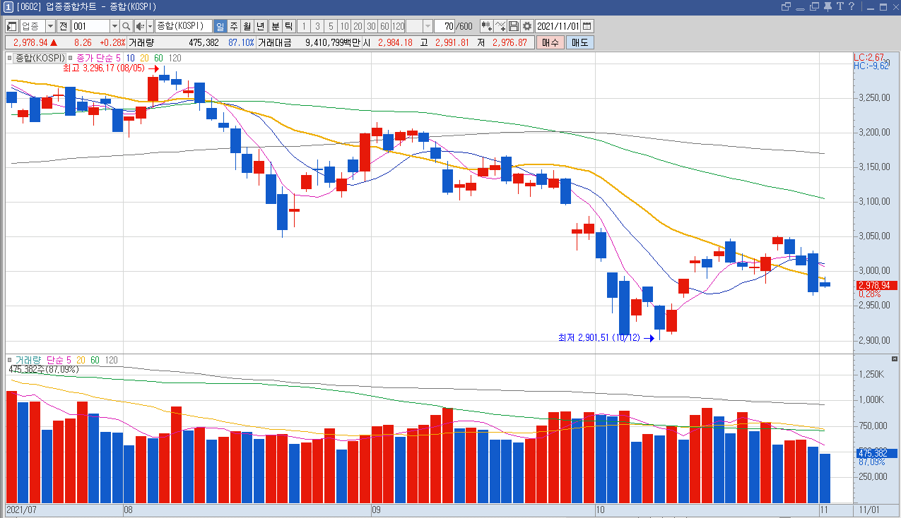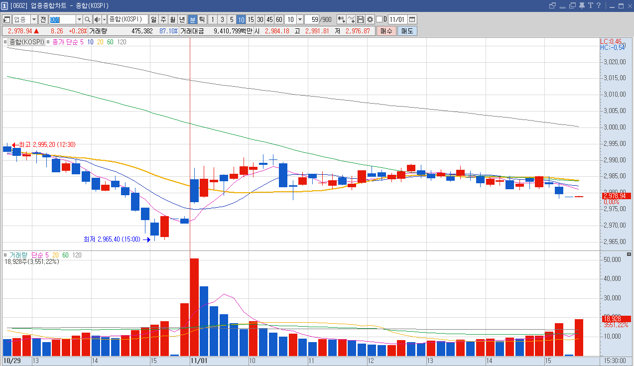 코스닥의 분봉 차트인데요, 보시면 저점을 아주 조금씩이지만 높이면서 상승하는 흐름이 연출되었습니다. 코스피보다는 더 긍정적인 흐름인데요, 코스닥은 상승추세로의 전환을 예감? 할 수도 있는? 그런 흐름이 나왔습니다. 확실한 건 내일 지켜봐야겠지만요.