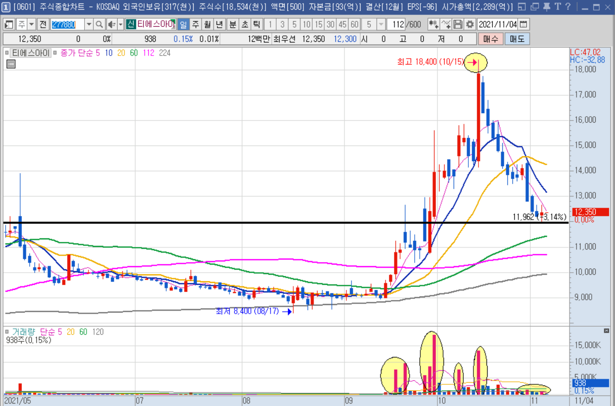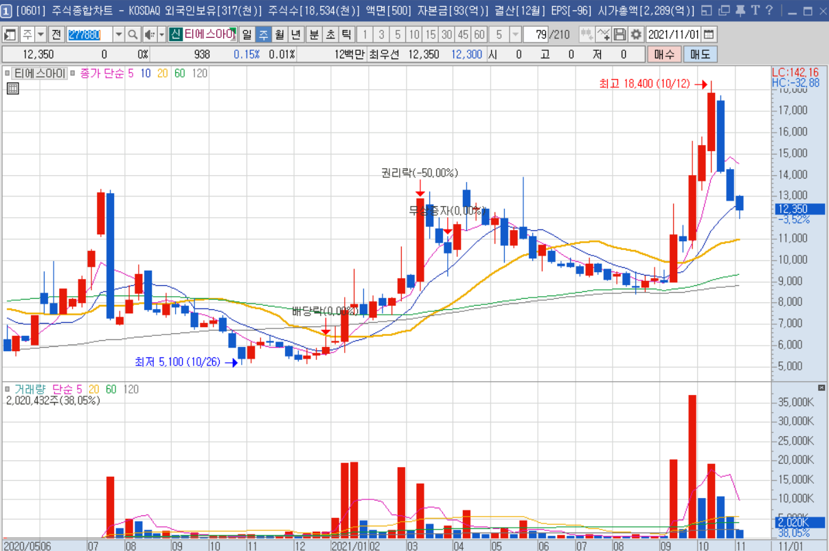 마지막으로 소개드릴 종목은 티에스아이라는 종목인데요. 2차전지 관련주로 묶여있고 테슬라에 납품할 수 있다는 소식이 나오면서 급등했던 종목 입니다. 보시면 이미 9월부터 매집의 흔적이 있구요. 상승을 9월 중부터 시작해서 10월 내내 올랐던 종목 입니다. 상승 파동의 길이와 세기도 가장 컸던 종목이구요.