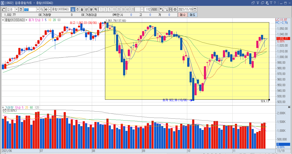 박스권의 크기 자체가 완전 다르죠? 코스피 형님과 완전히 다른 모습을 보이고 있습니다. 물론 최근의 저점이었던 970포인트를 깨고 10월에는 922포인트부근까지 내려갔었는데요. 최근에는 다시 980포인트 부근을 지켜주면서 올라온 흐름이 관찰되었고 지금의 위치도 이전의 전고점인 1050포인트 부근과 매우 가깝습니다. 어떤가요? 그나마 미국시장과 비슷한 흐름으로 가고 있는 건 코스닥이라고 느껴지지 않으신가요? 그나마 괜찮은 방향성을 보이고 있는 건 코스닥지수라는 느낌이 드는군요. 하지만 여전히 변동성이 커 보입니다. 하루동안 주가의 변화율이 상당히 큰 편입니다... 또한 음봉의 크기가 확실히 더 커보이구요. 떨어질 때 한번에 수직낙하 하는 흐름이 언제든지 나올 수 있겠네요.