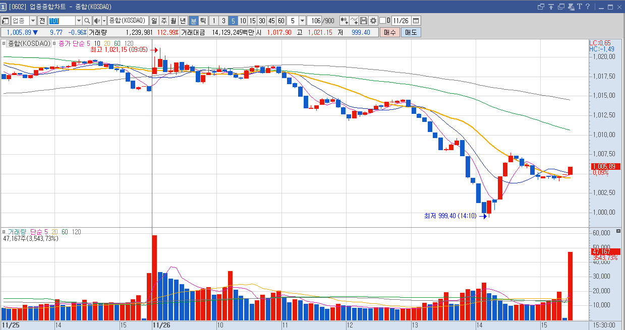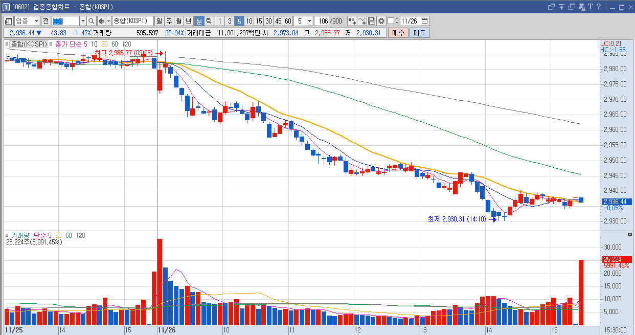 보시면 장 중에 살려주는 흐름 한번 없이 쭉쭉 떨어졌습니다. 상당히 안 좋은 흐름을 보였다고 보실 수 있겠는데요.