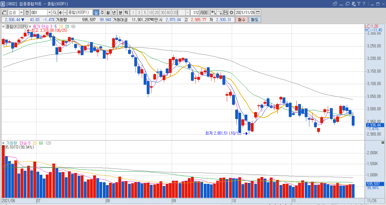 금일 시장 분위기가 좋지 않았죠. 오늘 미국장 선물은 더 큰 폭으로 떨어지고 있다고 하니 아마 차주 월요일에는 큰 폭락이 나올 수도 있는 여건이 마련될 듯 합니다.