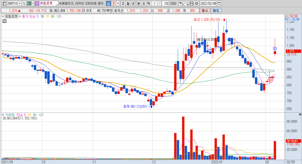 주봉상 바닥에 가까운 흐름이었구요, 지지선이 750원 정도 되어 보이는 종목이었습니다. 이 종목은 사실 위험요소가 조금 있는 종목이었는데 원래라면 들어가지 않았을 종목 이었을 것 같습니다. 하지만 최근에 로봇 테마의 흐름이 좋았었고, 수급이 잘 들어왔었던 기억이 있었기 때문에 한번 정도는 파동이 나와줄 것이라고 기대를 하였고, 일봉 상으로도 흐름이 괜찮아 보였습니다.