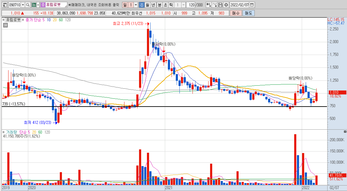 2번째 종목은 휴림로봇이라는 종목인데요. 이 종목도 차트를 보면서 설명 드리겠습니다.