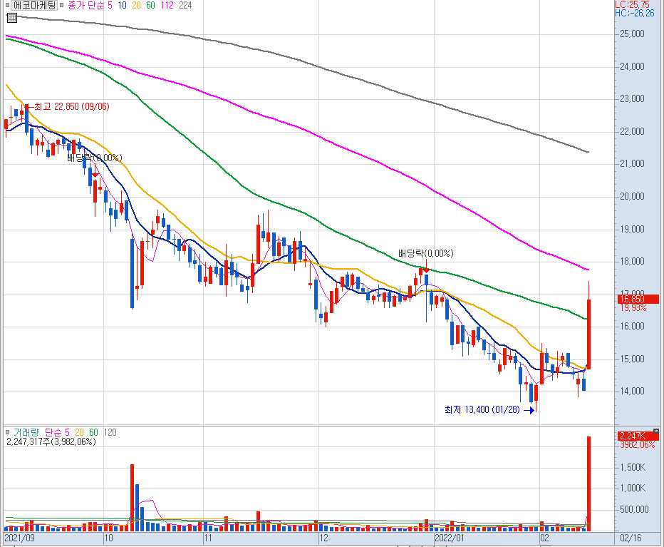 주가가 이렇게 시장의 관심을 받지 못하고, 추세적으로 하락하게 되면 모든 이평선이 역배열을 하게 됩니다. 에코마케팅 종목도 모든 이평선이 역배열을 띄면서 주가가 계속 반등 없이 하락하고 있는 형태 였습니다. 종목이 힘을 받지 못하고 이렇게 계속 하락할 때는 관심있게 지켜볼 필요가 없습니다. 그런데 큰 거래량을 동반한 수급과 함께 강한 상승이 나왔을 때는 관심있게 지켜봐야 합니다.