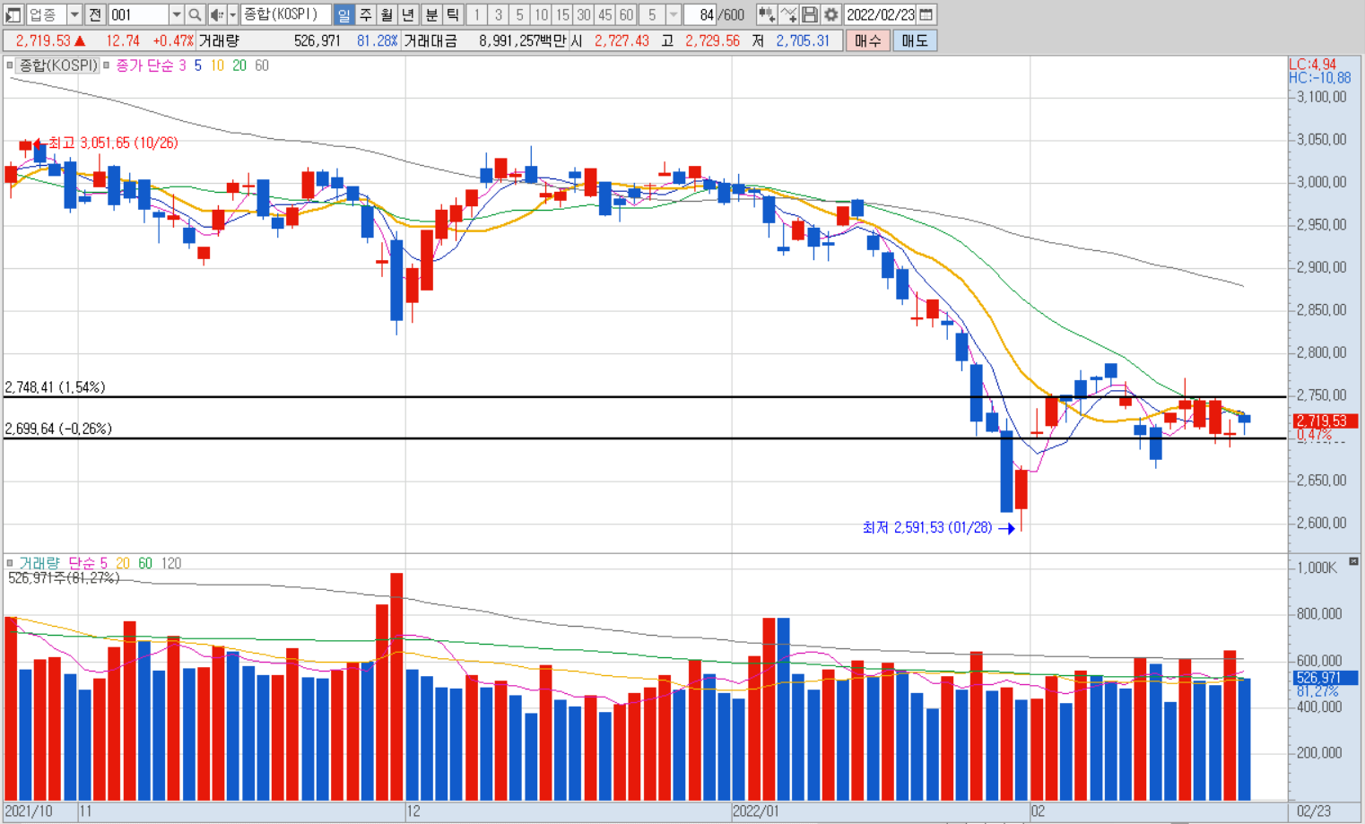 코스피 지수 일봉 차트의 흐름입니다. 보시는 것처럼 아주 작은 박스권 안에서 머무르는 모습을 보이고 있는데요. 이 작은 구간에서도 봉 길이는 제법 되는데 그만큼 일 변동성이 큰 움직임을 보였습니다. 다행인 것은 양봉의 형태로 떨어지면 올라가고 내려가면 다시 올려주고, 이런 흐름이 반복이 되었습니다. 어제와 오늘은 그마저도 봉의 형태가 약해지면서 위 아래 변동성도 조금씩 줄어드는 모습을 보였고, 오늘은 하락했던 부분을 다시 밀어 올리면서 마감되었습니다. 여전히 2750과 2700 사이에 머무는 모습 입니다. 지금 같은 상황에서 모멘텀이 실종된 느낌 입니다. 위로든 아래로든 방향을 제시하지 않고 누구도 나서서 사거나 팔지 않으면서 적당히 내리면 사고, 적당히 오르면 파는 느낌입니다.