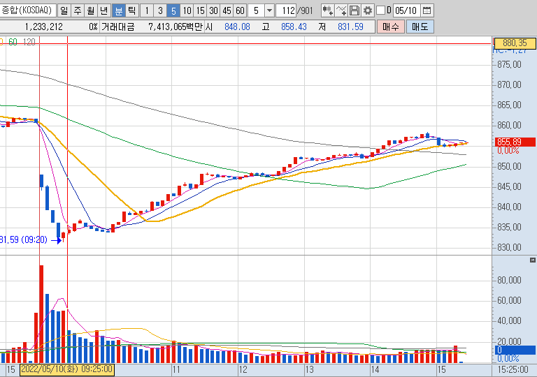 코스닥지수를 살펴보면 이전 전저점 부근인 850포인트 부근을 지지해주는 흐름이 나왔으며, 추세가 바뀔 때 나오는 샛별형 캔들이 출현하였기 때문에 저는 굉장히 긍정적으로 바라보고 있습니다. 때문에 오늘 장에서 배팅을 좀 하였네요. 보통 이런 모양의 캔들이 나왔을 경우에는 바닥이거나 바닥 부근, 혹은 다음날부터 상승 전환하는 경우가 많습니다. 물론 100%라는 것은 없지만 과거의 경험을 보았을 때 그럴 확률이 높다, 라고 판단하는 것이죠. 장 초반에 큰 음봉의 형태였던 것이 장 마감 때는 아랫꼬리가 달린 양봉으로 바뀌었으니까요.