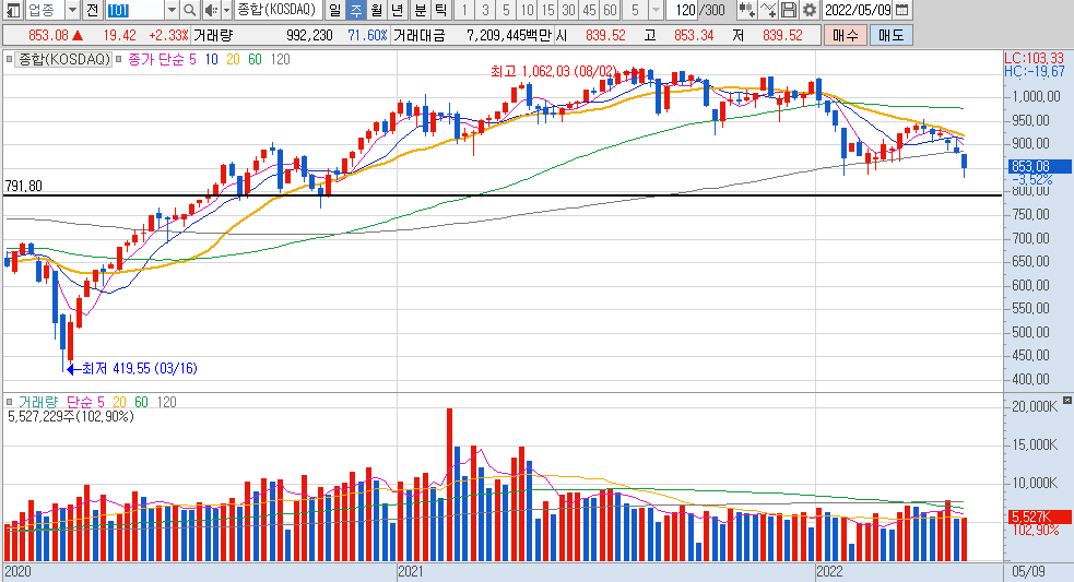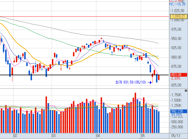 코스닥 주봉차트에서 보여지는 것처럼 최소 800포인트 근처까지는 떨어질 수 있다고 보았습니다. 지금구간으로부터 약 6% 정도의 하락이 더 나올 수 있는 것이죠. 지금도 계좌상황이 좋지 않고 마이너스가 상당하기 때문에 앞으로 6%가 더 떨어진다면 참 심란하겠죠.