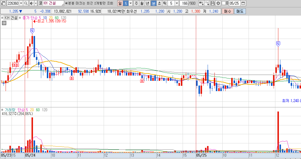 분봉으로 살펴보면 조금 더 디테일하게 살펴볼 수 있습니다. 23일 종가 부근에서 저가 지지하면서 오르는 흐름 나와서 진입 하였고, 24일 장 초반에 슈팅 나와서 일부 익절하였습니다. 이후에 다시 눌리는 구간에서 분할로 매수 하였고 다시 25일인 오늘 슈팅 나올 때 익절하고 나왔습니다. 보시면 슈팅이 굉장히 짧은 시간 들어왔다가 나간 걸 확인하실 수 있는데 봉 1개가 5분인 것을 감안하면 5분도 채 안되는 시간동안 상승과 하락이 나오고 가격이 거의 제자리 수준으로 복귀하는 걸 보실 수 있습니다. 요즘 이렇게 짧게 슈팅주고 빼는 경우가 너무 많아서 장 중에 제대로 대응하지 못하면 수익 보기가 쉽지 않은 장이죠. 단타는 하려면 이렇게 실시간으로 빠르게 대응을 해야해서 직장생활 하는 분들에게는 추천드리지 않는 매매 입니다. 조금 더 여유롭게 대응하고 보유하는 스윙이 최적의 형태가 되겠네요. 저도 메인은 스윙매매이고 단타는 소액으로 현금흐름을 창출하는 용도 정도로만 하려고 하고 있습니다.
