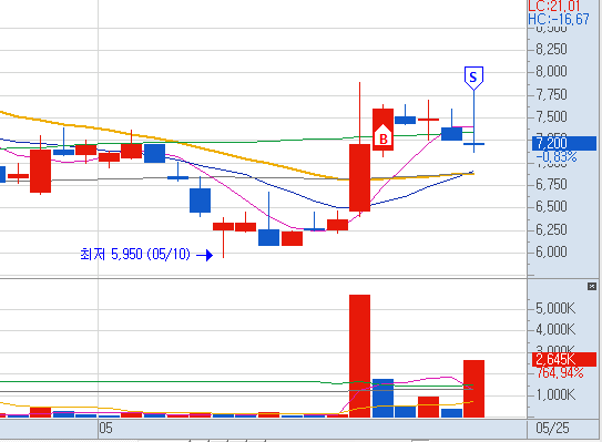분봉상 차트를 보면 장 초반부터 꾸준히 올라줬고 9시 30분쯤부터 큰 수급이 들어오면서 크게 슈팅을 줬습니다. 완전 꼭대기는 아니지만 하락이 나오기 전에 고점부근에 걸어놓으면서 자연스럽게 엑시트 할 수 있었네요. 조금만 더 높게 걸어놨더라면 못 빠져나올 수도 있었겠네요. 약 10분 사이에 슈팅이 나오고 3분동안 다 빼버렸기 때문에 순간 타이밍을 놓쳤다면 수익을 못 보고 나올 수도 있었습니다. 요즘에 장이 불안하다보니까 이렇게 잠깐 슈팅주고 빼는 경우가 너무 많습니다.