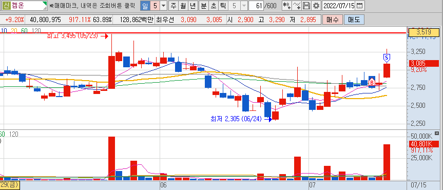 이 종목은 특이하게도 시초가부터 공략을 들어갔는데요, 제 예상으로는 13일날부터 슈팅이 나올 줄 알고 들어갔는데 14일까지 눌리는 흐름이 나와서 당황했던 종목이기도 합니다. 그러나 지지해주는 세력의 느낌이 있었고, 분명 슈팅이 나올 수 있다고 판단했습니다. 물론 리스크 관리 차원에서, 그리고 시장 상황 때문에 추가 매수를 진행하지 못했는데 이 부분은 개인적으로 조금 아쉽네요. 원래대로라면 추가 매수를 들어갔어야 하거든요.