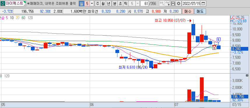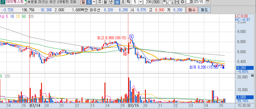 첫번째 종목은 아이퀘스트 입니다. 최근에 소프트웨어 회사 인수로 인해 급등이 나왔었고, 매물 소화 하는 과정 중에 눌리는 구간에 진입하여서 수익을 챙기고 나왔습니다. 이게 일봉상으로 보면 상당히 밋밋해 보이는 느낌이 있네요.
