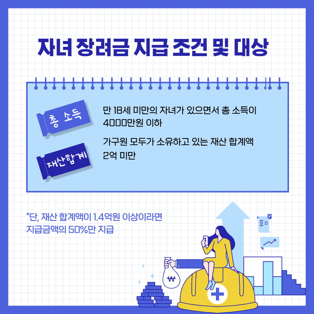 행복한 임신 및 출산을 장려하고 또한 저소득 가구의 자녀 양육에 대한 부담을 줄이기 위해서 2015년부터 지급하고 있습니다. 총 소득 4000만원 이하이면서 부양자녀(만 18세 미만)가 있고, 가구원 모두가 소유하고 있는 재산합계액이 2억원 미만인 경우에 신청 가능 대상이 됩니다. 단, 2억원 미만의 재산일지라도 1.4억원이 넘는 재산이 있을 경우에는 지급액의 50%만 지급됩니다.
